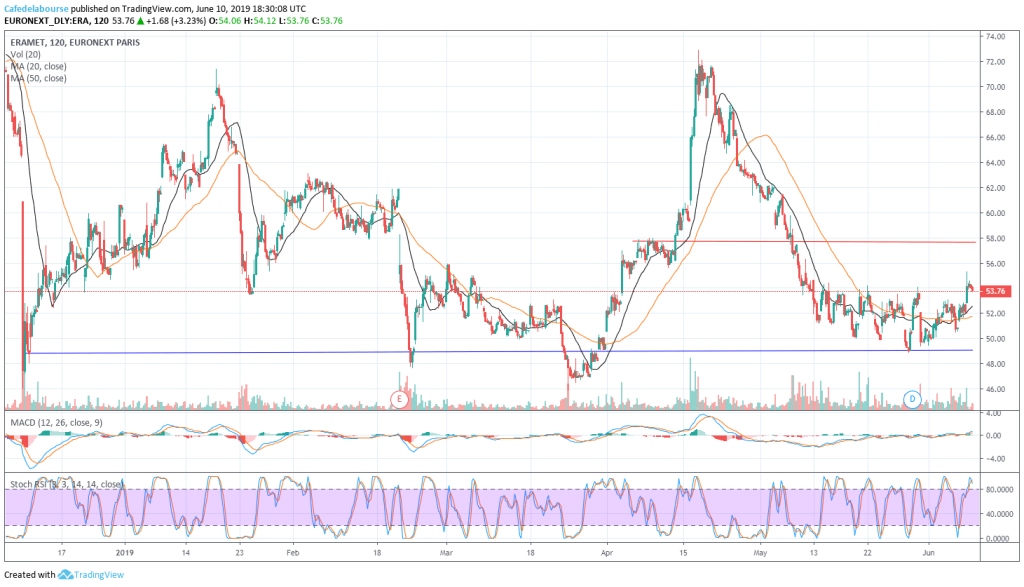 Cependant, le RSI stochastique est en zone de surachat. Nous préconisons d’attendre le retour du RSI dans la zone neutre, avant de se positionner à l’achat dans un objectif de cours des 57-58 € (en rouge sur le graphique). Un passage sous 46 € invaliderait le scénario.