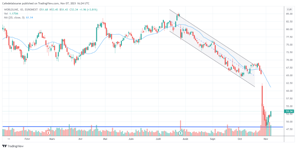 L’action Worldline est en baisse de près de 35 % depuis le début de l’année 2021. On notera la chute de 20 % à la suite de la publication du 27 octobre, jugée décevante par les investisseurs.