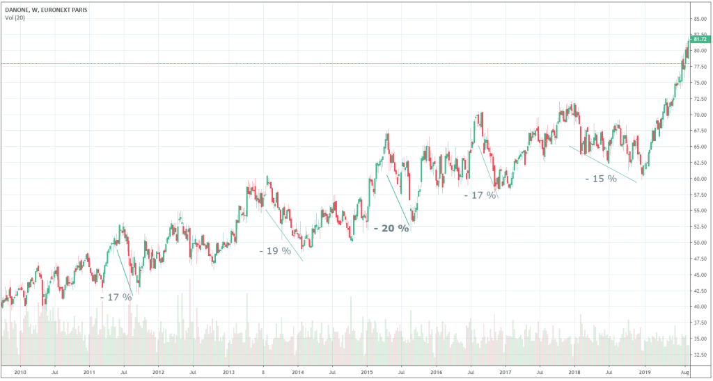 Le maximum drawdown au cours des 10 dernières années de l’action Danone a été observé entre le 20/04/15 et le 07/09/15, le cours ayant chuté de 66,98 € à 53,32 €, ce qui représente une baisse de – 20 %.