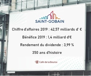 Le rendement 2019 de l’action Saint-Gobain est de 3,99 % à son cours de Bourse du 21 août 2020, établi à 33,36 €.