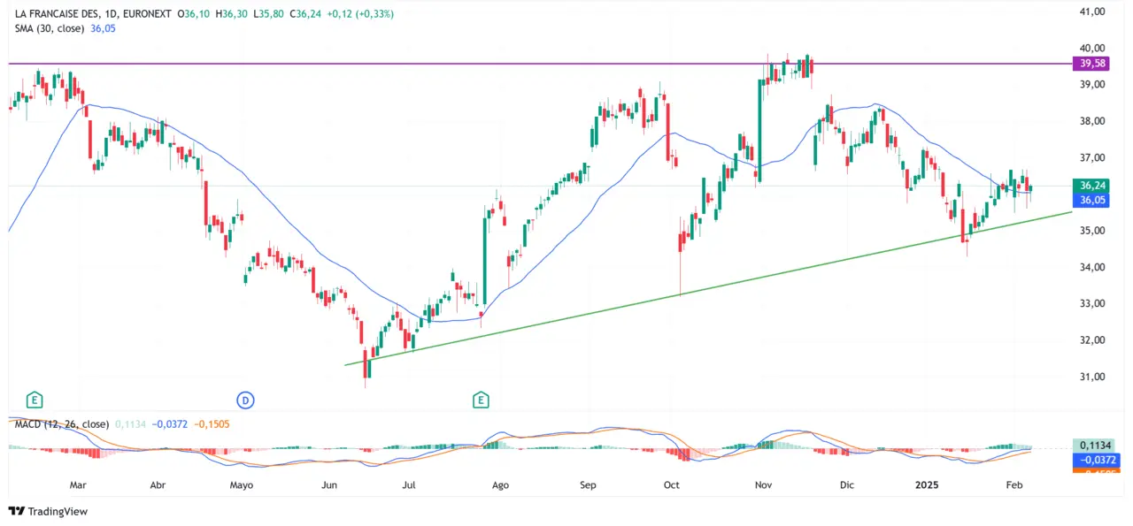 L’action FDJ marque une baisse de -6,1 % sur les 12 derniers mois, avec une configuration intéressante depuis le mois de juin 2024 et son plus bas des 12 derniers mois (au niveau des 31,5 euros. Le titre FDJ est supporté par une droite oblique ascendante (en vert sur le graphique) qui a été testée à nouveau début 2025. Le prochain niveau de support se situe sur la zone des 39,6 euros (en violet sur le graphique). À moyen terme, la tendance de l’action FDJ est positive avec un cours de bourse au-dessus de sa moyenne mobile à 30 jours (en bleu sur le graphique). La tendance de l’action FDJ à court terme est également positive avec une MACD positive et au-dessus de sa ligne de signal.