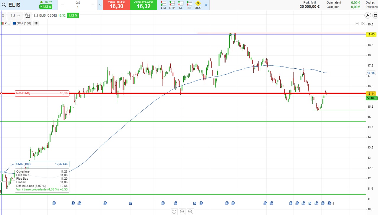 Au mois de juillet 2023, les cours de Bourse d’Elis ont atteint leur plus haut annuel à 19 euros, avant d’entamer une période de baisse qui est encore d’actualité aujourd’hui, avec un plus bas à 15,27 euros.